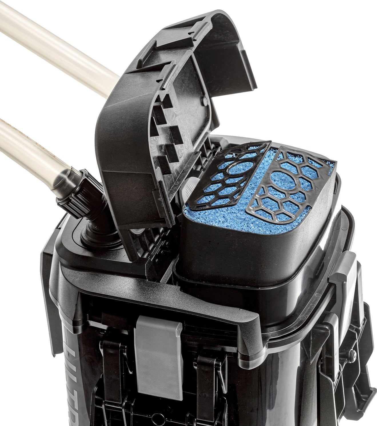 A pesar de su alto rendimiento para acuarios de 100 a 750 litros, el ULTRAMAX BT funciona de forma extremadamente silenciosa gracias a su eje cerámico de alta calidad, lo que lo hace ideal para salas de estar o dormitorios. Además, es energéticamente eficiente, con un consumo variable a partir de tan solo 6,1 vatios. El kit completo, que incluye mangueras, accesorios y una selección optimizada de esponjas y BioceraMax, le permite empezar a usarlo inmediatamente después de la instalación.