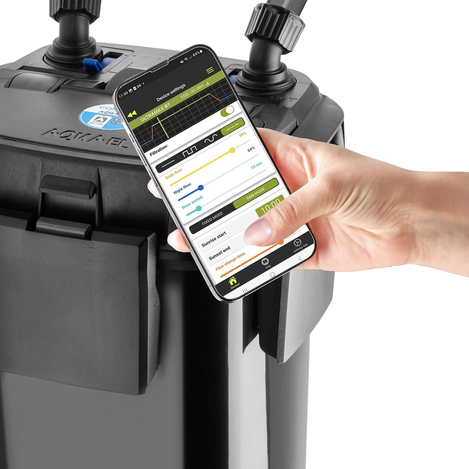 Imagina poder optimizar las condiciones de vida de tu mundo submarino desde la comodidad de tu sofá. Con el ULTRAMAX BT de Aquael , esto se hace realidad, ya que este moderno filtro externo se controla fácilmente a través de la intuitiva app de Aquael . Puedes ajustar con precisión el caudal o elegir entre fascinantes modos de flujo como "pulsante" o "sine", todo con un simple toque en tu smartphone. La función Día y Noche integrada es especialmente inteligente, simulando ritmos naturales al reducir automáticamente el caudal por la noche. También puedes programar horarios de alimentación para que el filtro reduzca temporalmente la potencia durante la alimentación, garantizando que tus peces disfruten de una comida tranquila y sin estrés.
