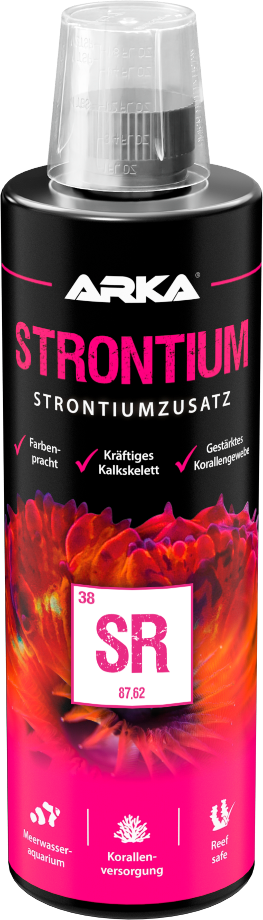 Estroncio como suplemento con estabilizador de pH en una forma altamente disponible. No solo previene la deficiencia de estroncio, sino que también promueve de manera sostenible el crecimiento saludable de los corales y fortalece los tejidos y el esqueleto de calcio.