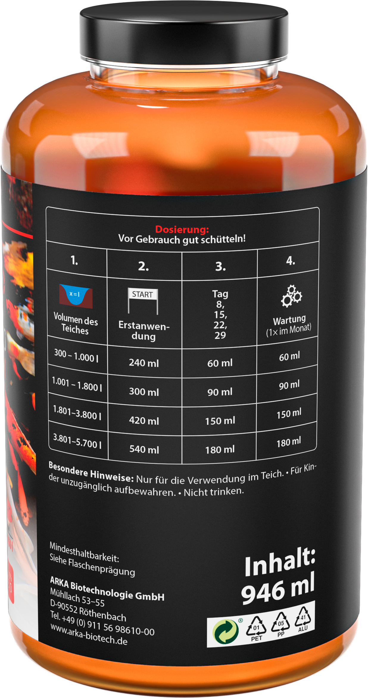 Bienestar para los peces de estanque: TheraP Pond de ARKA favorece el bienestar de los animales gracias a bacterias probióticas especialmente desarrolladas. Los organismos vivos descomponen los residuos orgánicos y los excrementos y aumentan el nivel de sustancias disueltas y oxígeno en el agua. Esto se traduce en numerosos beneficios para los peces: