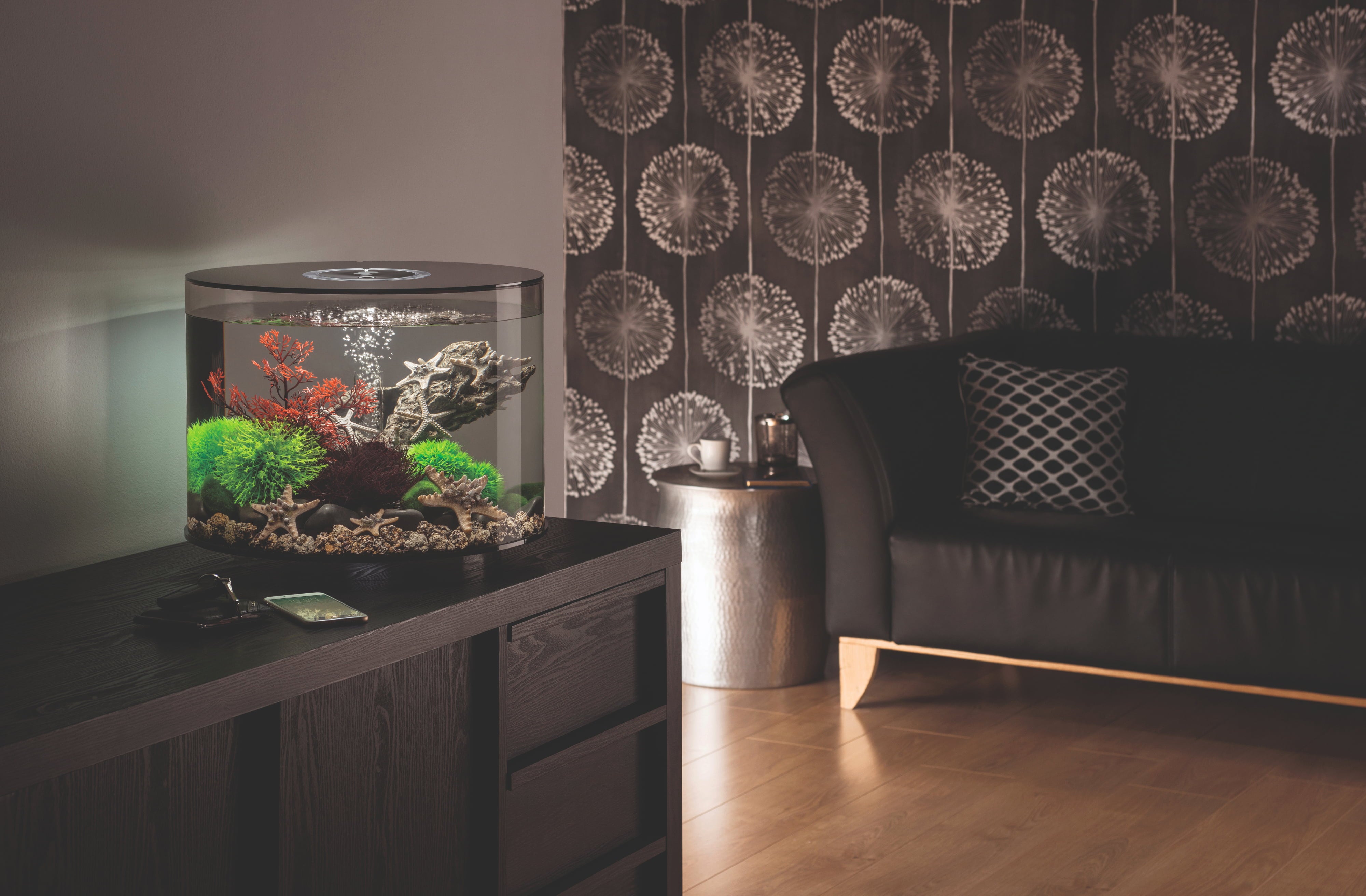 Sumérgete en el fascinante mundo submarino que te ofrece este nanoacuario de diseño elegante, sin bordes ni marcos. Con un diámetro de 41 cm y una altura de 36,9 cm, el acuario se integra armoniosamente en cualquier entorno y ofrece una vista panorámica de 360° de los peces y los adornos. La estructura merece especial atención: las paredes son de acrílico, un material mucho más ligero, estable y resistente que el cristal convencional.