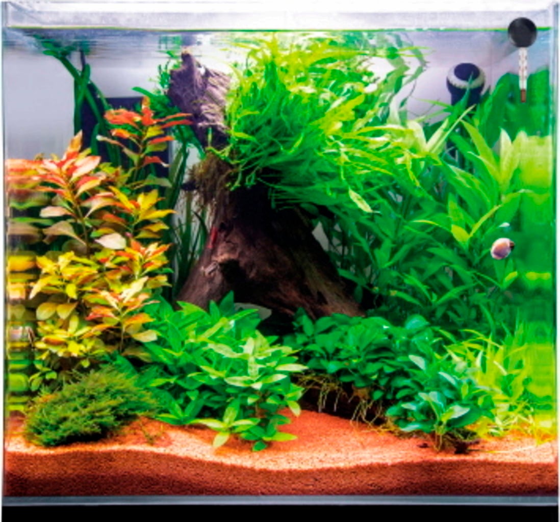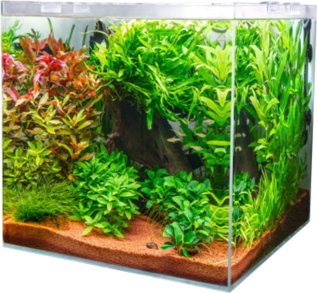 El secreto reside en el cristal extraclaro de este modelo. En comparación con los acuarios estándar, permite apreciar con mayor claridad los colores de los peces, el verde de las plantas y los patrones de los camarones, ofreciendo un efecto visual brillante y muy realista. El resultado es un ecosistema que parece vivo y bien definido.
