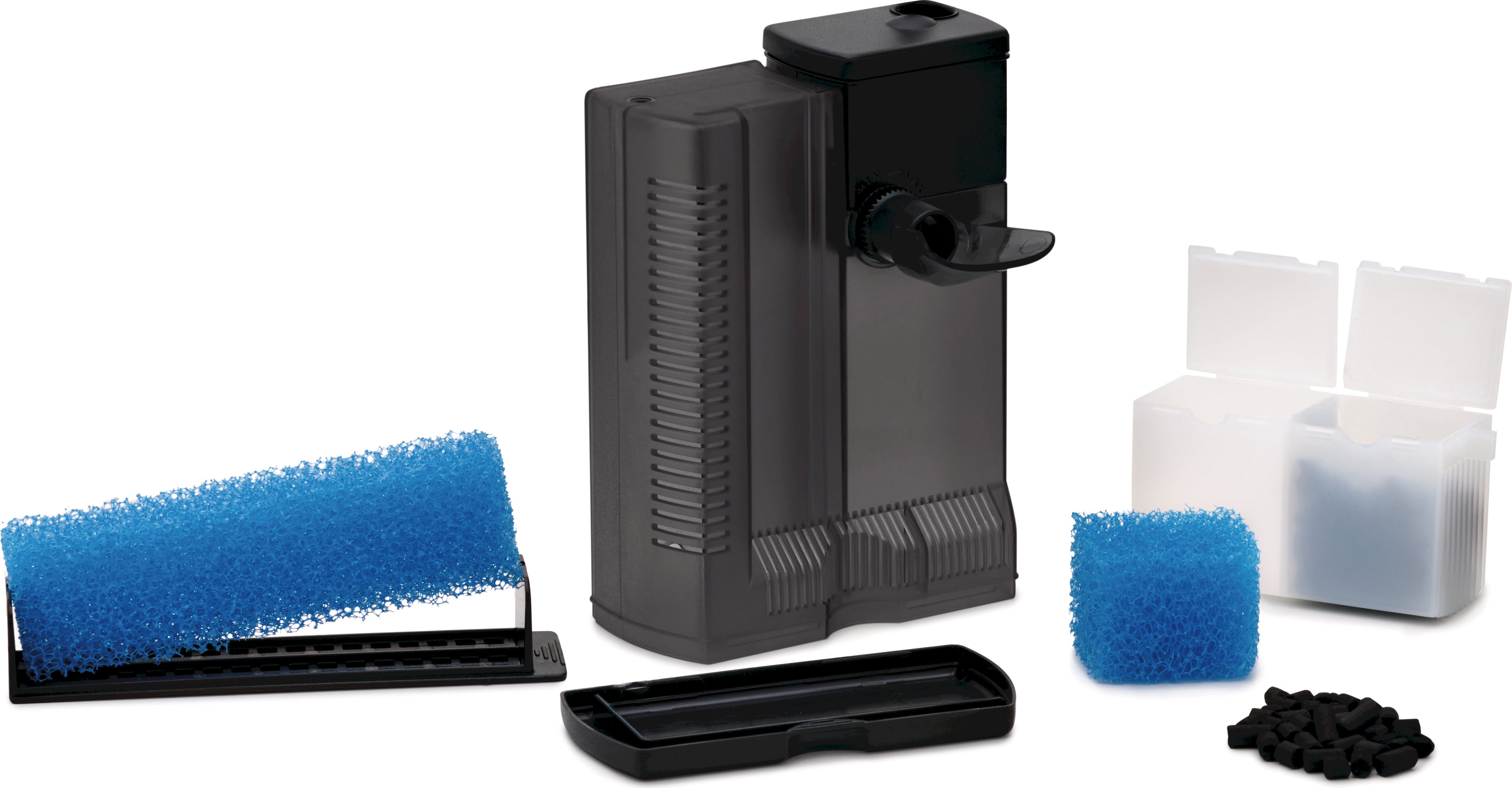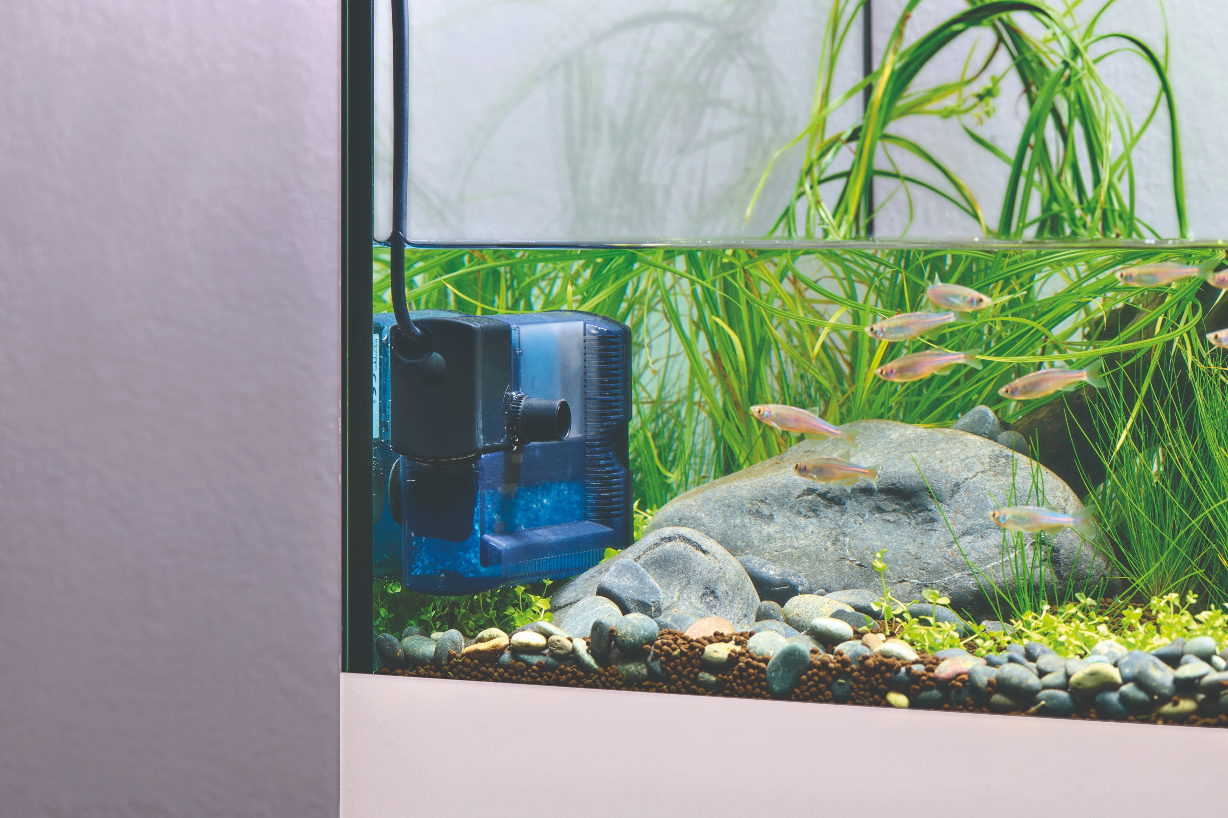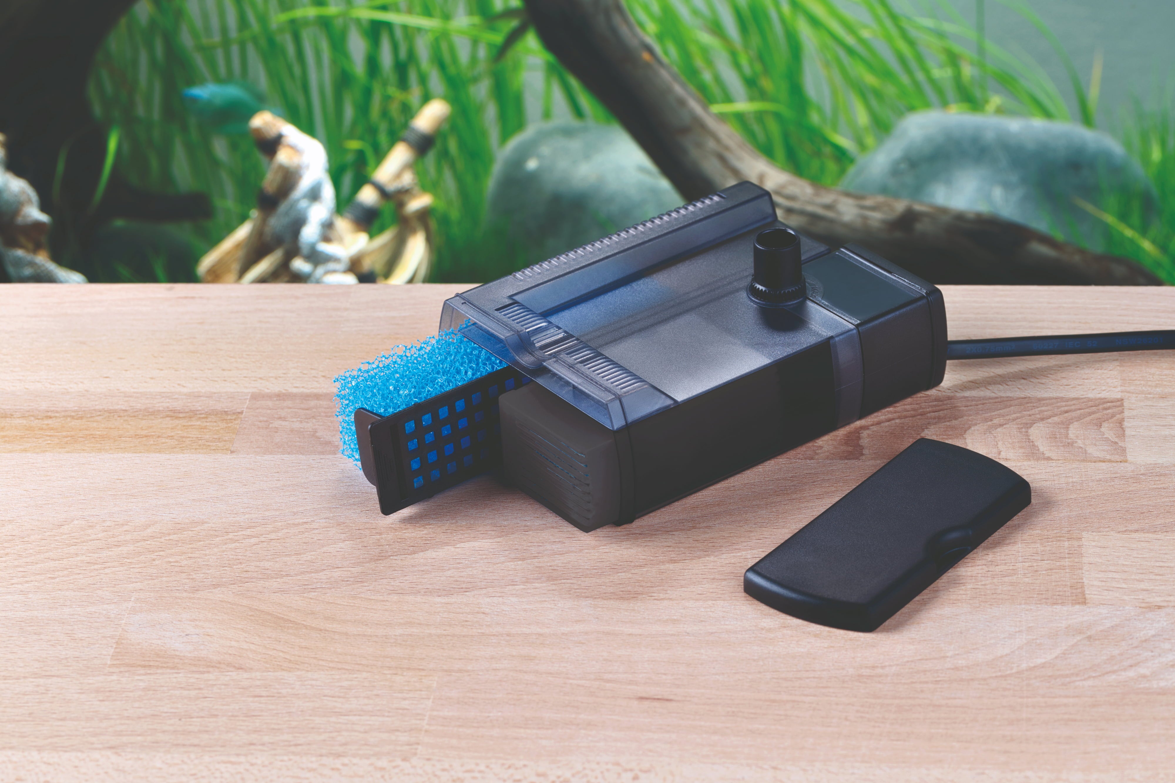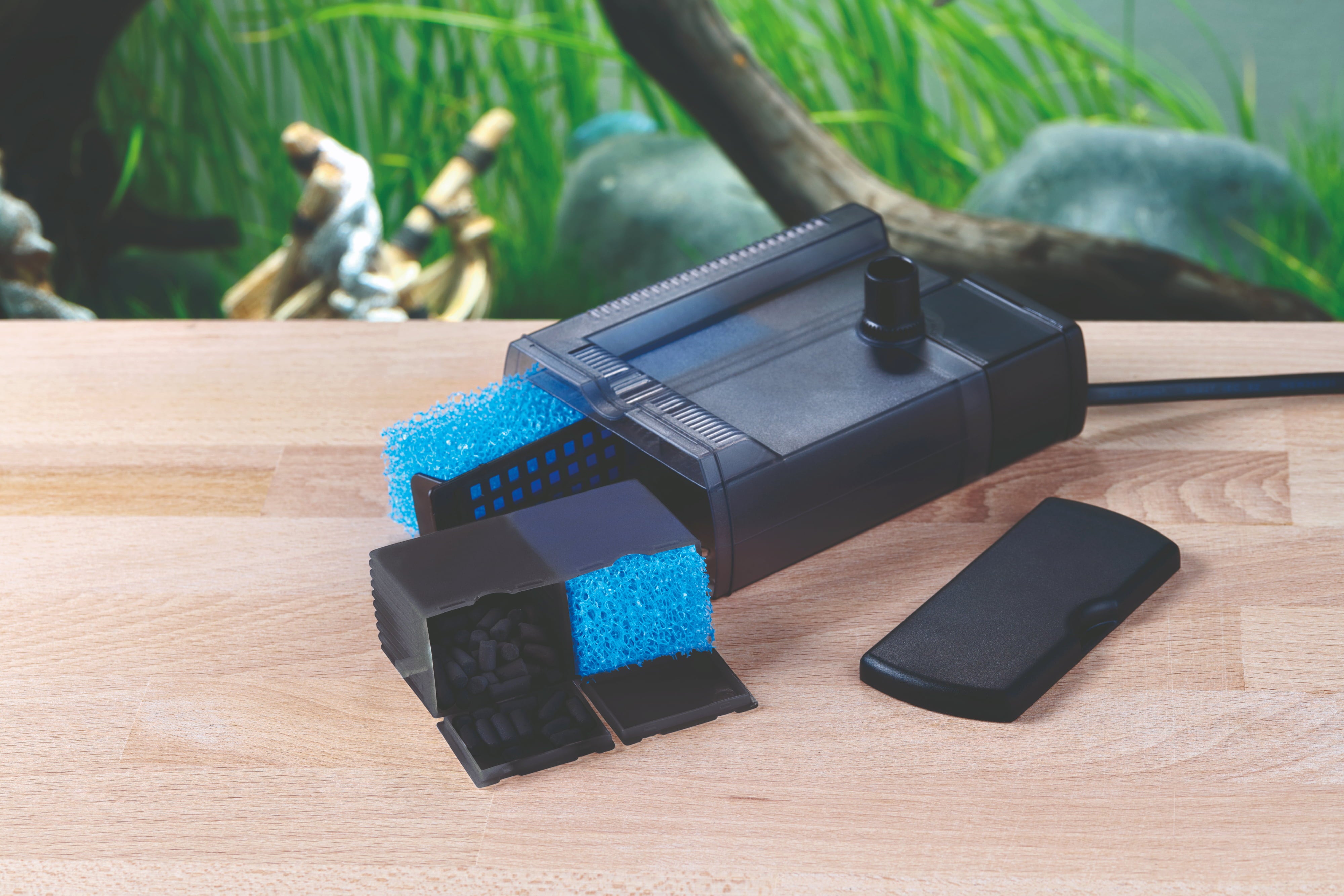El montaje es rápido y sencillo: gracias a las ventosas incluidas, el filtro se fija firmemente a la pared del acuario. También es apto para acuarios con poca profundidad y funciona de forma extremadamente silenciosa, sin perturbar la tranquilidad del hogar.