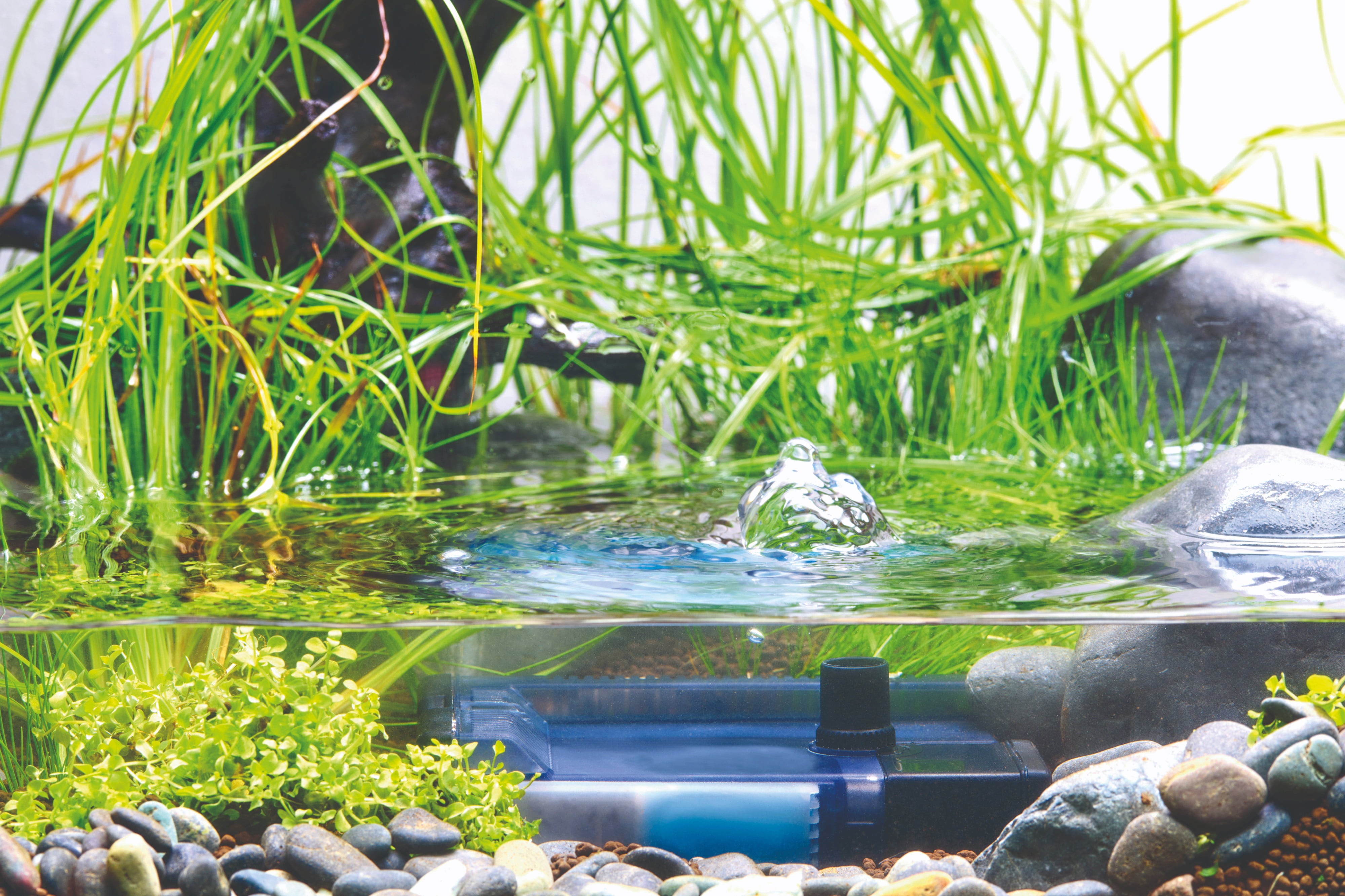 El caudal se ajusta fácilmente mediante un control específico, lo que permite adaptarlo a las necesidades de sus animales y plantas. Un difusor de agua ajustable también enriquece el agua con oxígeno, mejorando así las condiciones de vida dentro del acuario.