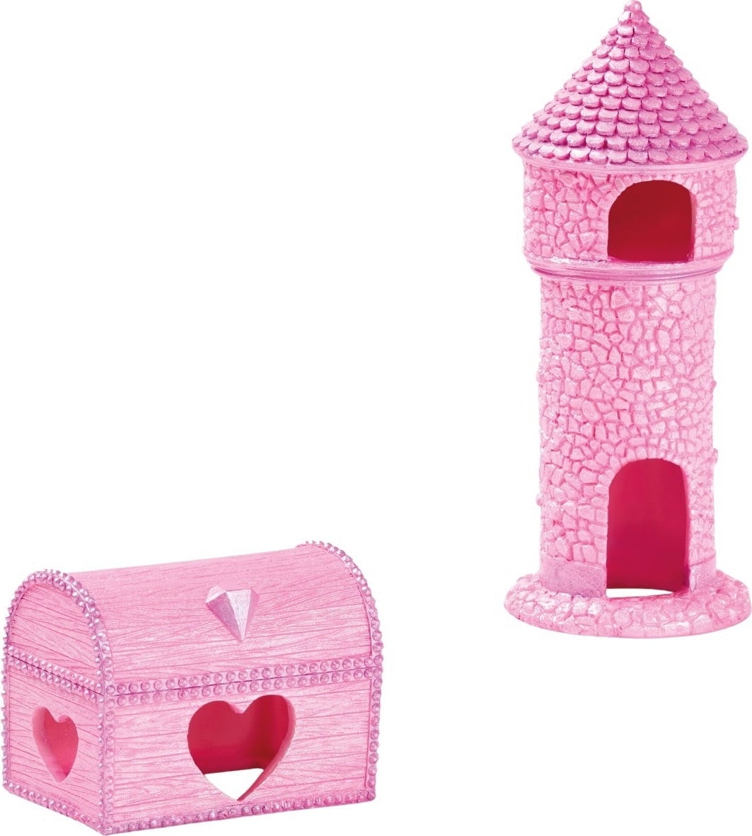 El set Eden Princesa consta de una torre y un cofre del tesoro. Fabricados en un elegante color rosa chispeante, estos dos elementos decorativos llaman inmediatamente la atención y se convierten en un auténtico punto focal en el acuario de agua dulce. Las ventanas y aberturas integradas permiten la entrada de peces, gambas y otros habitantes del acuario, proporcionando así refugios seguros y espacios estimulantes para el juego.
