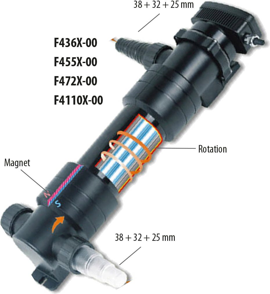 El aparato funciona con un sistema de flujo de agua giratorio, apoyado por magnetización, que garantiza un tiempo de permanencia óptimo del agua en la zona de irradiación. Esto reduce eficazmente la carga bacteriana y favorece la agregación de algas en suspensión. Un elemento transparente de la carcasa permite la inspección visual directa de la lámpara, sin necesidad de abrir la unidad.