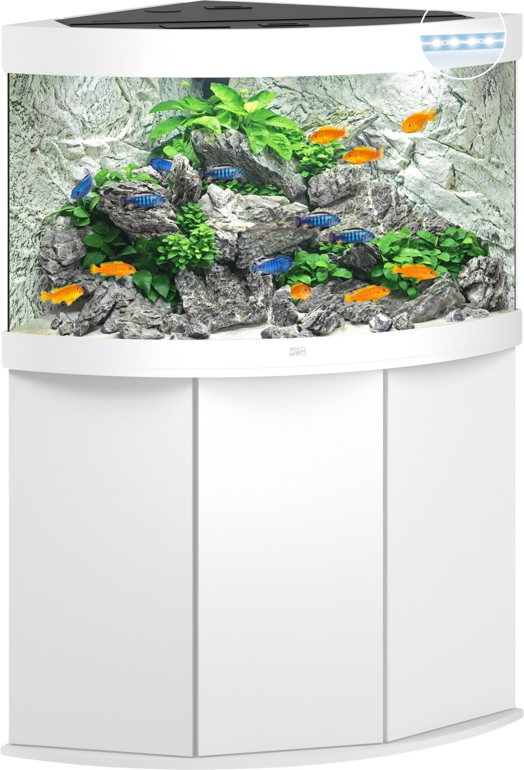 La combinación Juwel TRIGON 190 LED con mueble crea el escenario perfecto. Gracias a su impresionante profundidad, TRIGON 190 LED se integra a la perfección en cada rincón de la habitación y crea un remanso de paz para ti y toda tu familia.