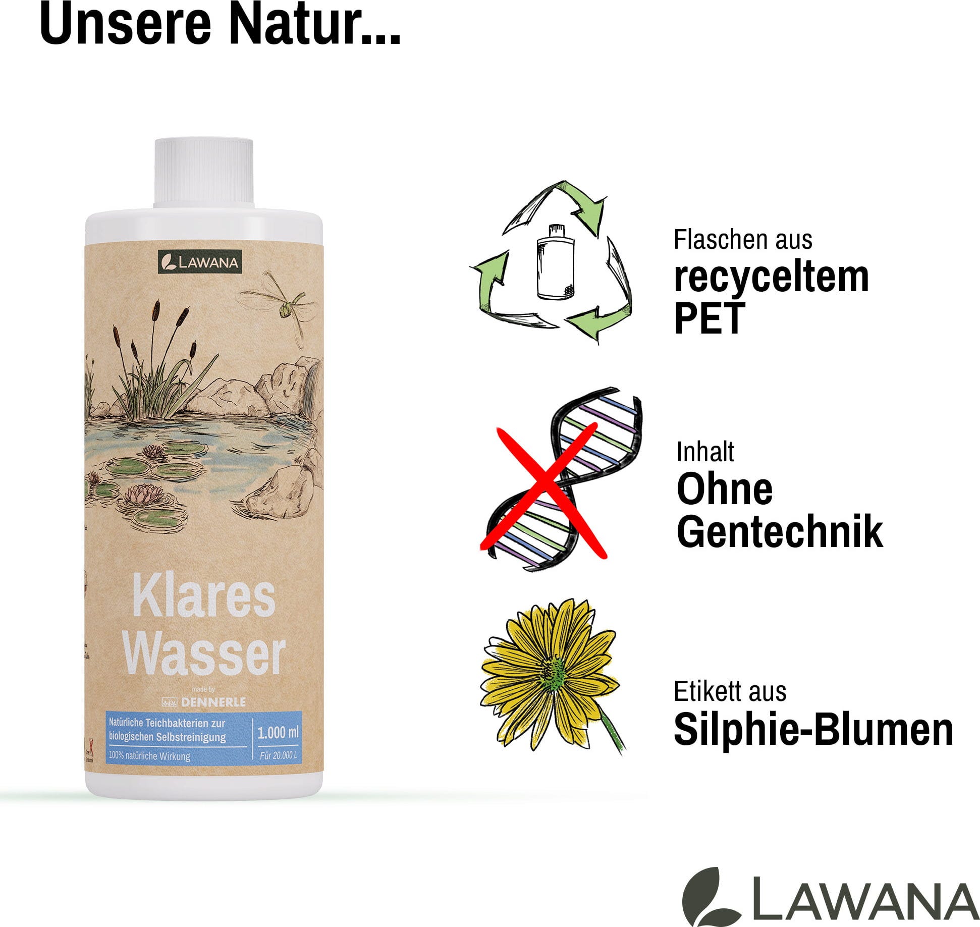 Ya sea para instalaciones nuevas, después de un cambio de agua o con una elevada población de peces, Clear Water de LAWANA garantiza grandes resultados y una profundidad visual impresionante en estanques koi, estanques de natación o instalaciones clásicas de jardín. Una ventaja especial: El producto no contiene OGM y cuida el agua de forma natural