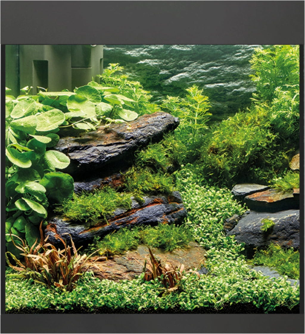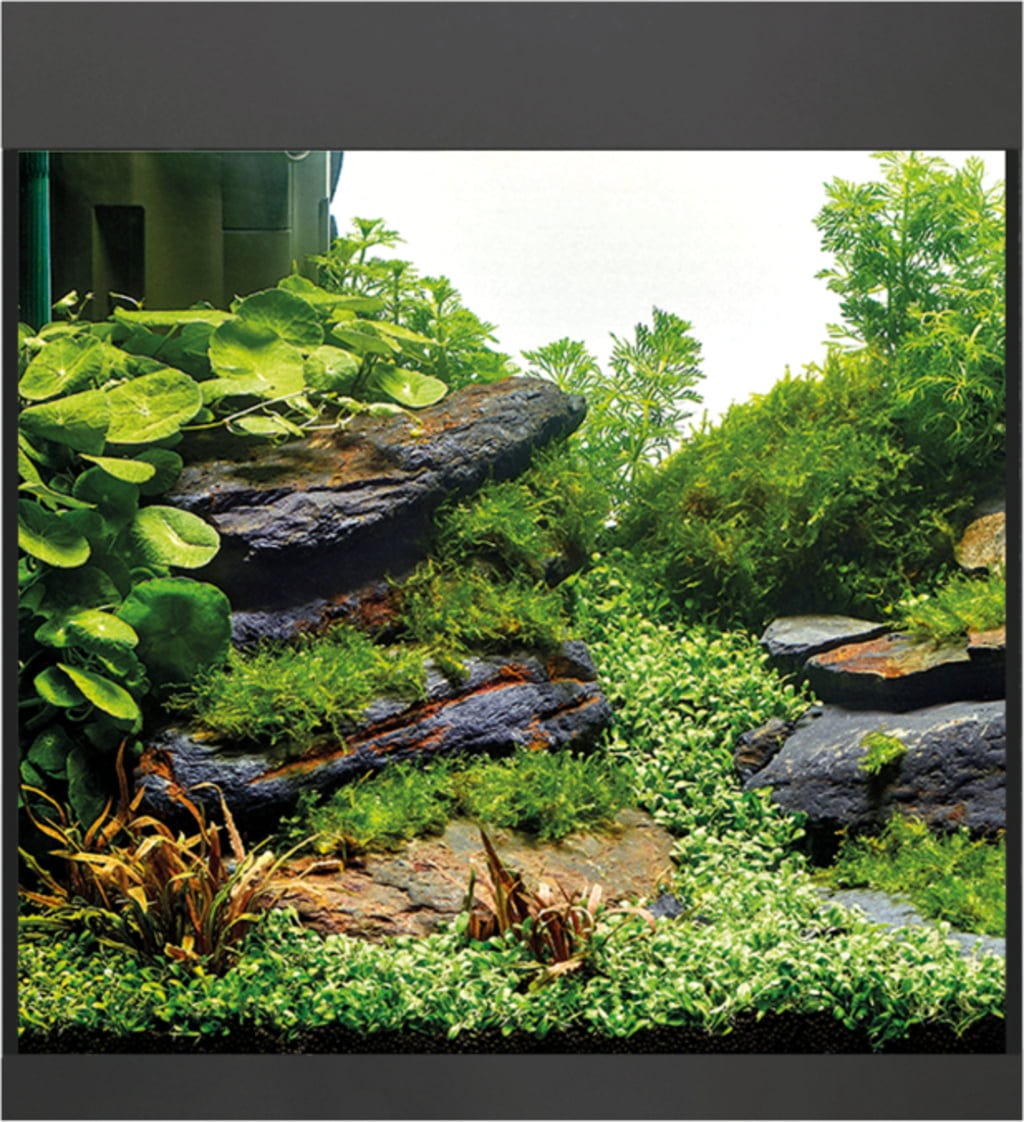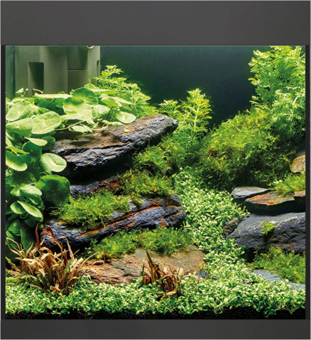- La cubierta del borde del agua y el embellecedor para la grava están laminados y enmarcan con estilo a los habitantes del acuario y las plantas