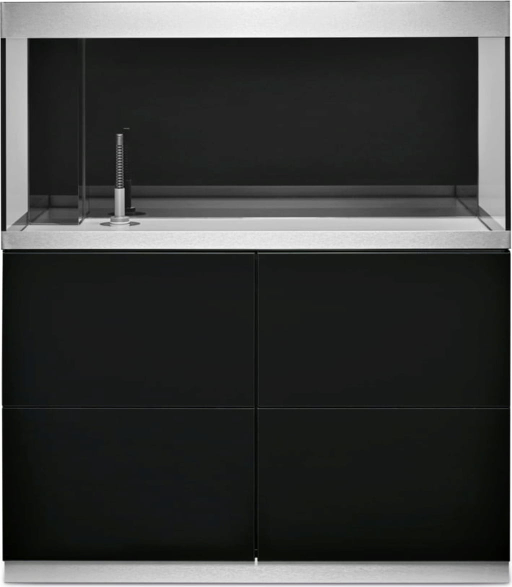 Las puertas del mueble sin tiradores con apertura por presión garantizan unas líneas limpias, y los embellecedores de aluminio del acuario ocultan además los bordes poco estéticos.