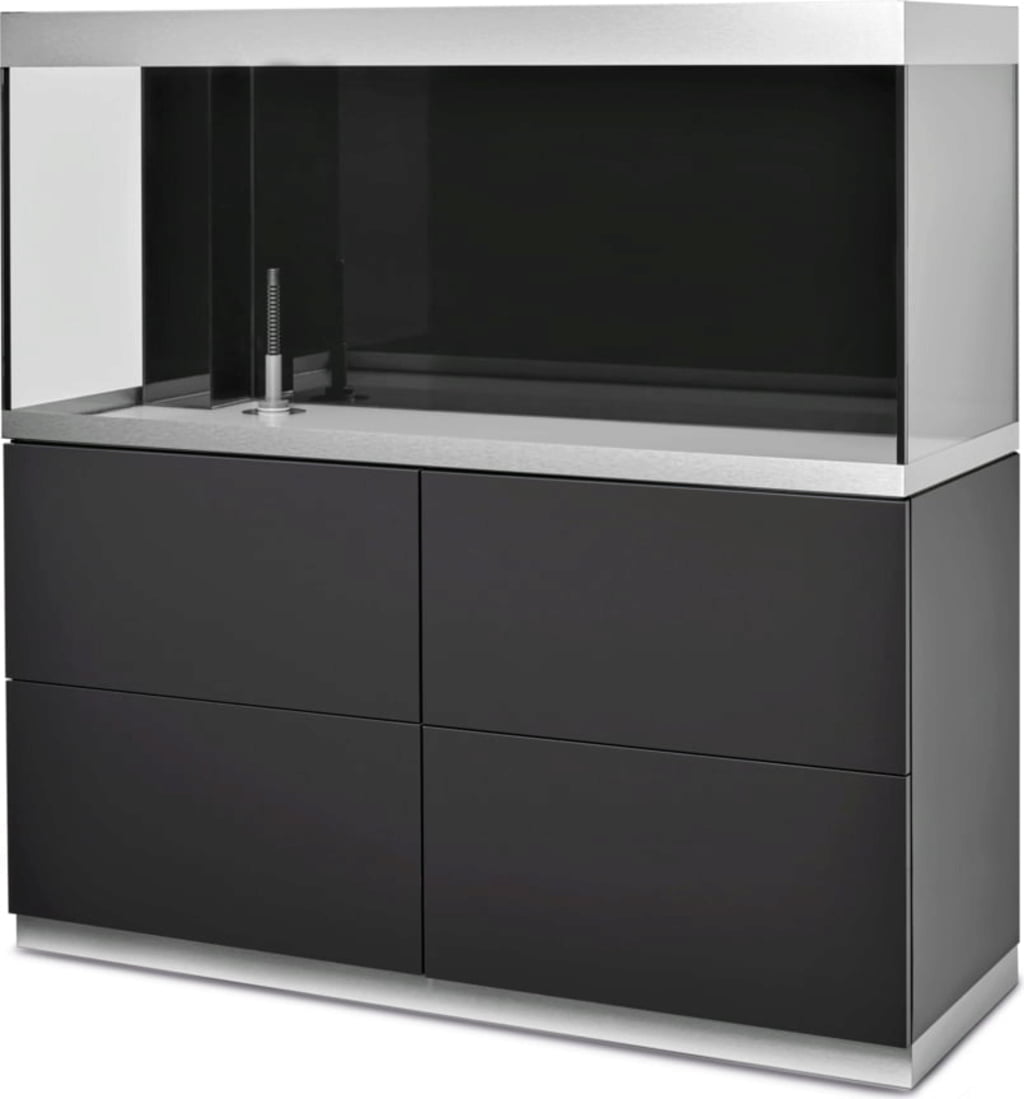 Las puertas del mueble sin tiradores con apertura por presión garantizan líneas limpias, y los embellecedores de aluminio del acuario ocultan los bordes antiestéticos. Los muebles HighLine para acuarios a partir de 200 litros pueden equiparse opcionalmente con hasta dos cajones, proporcionando así más espacio de almacenamiento.