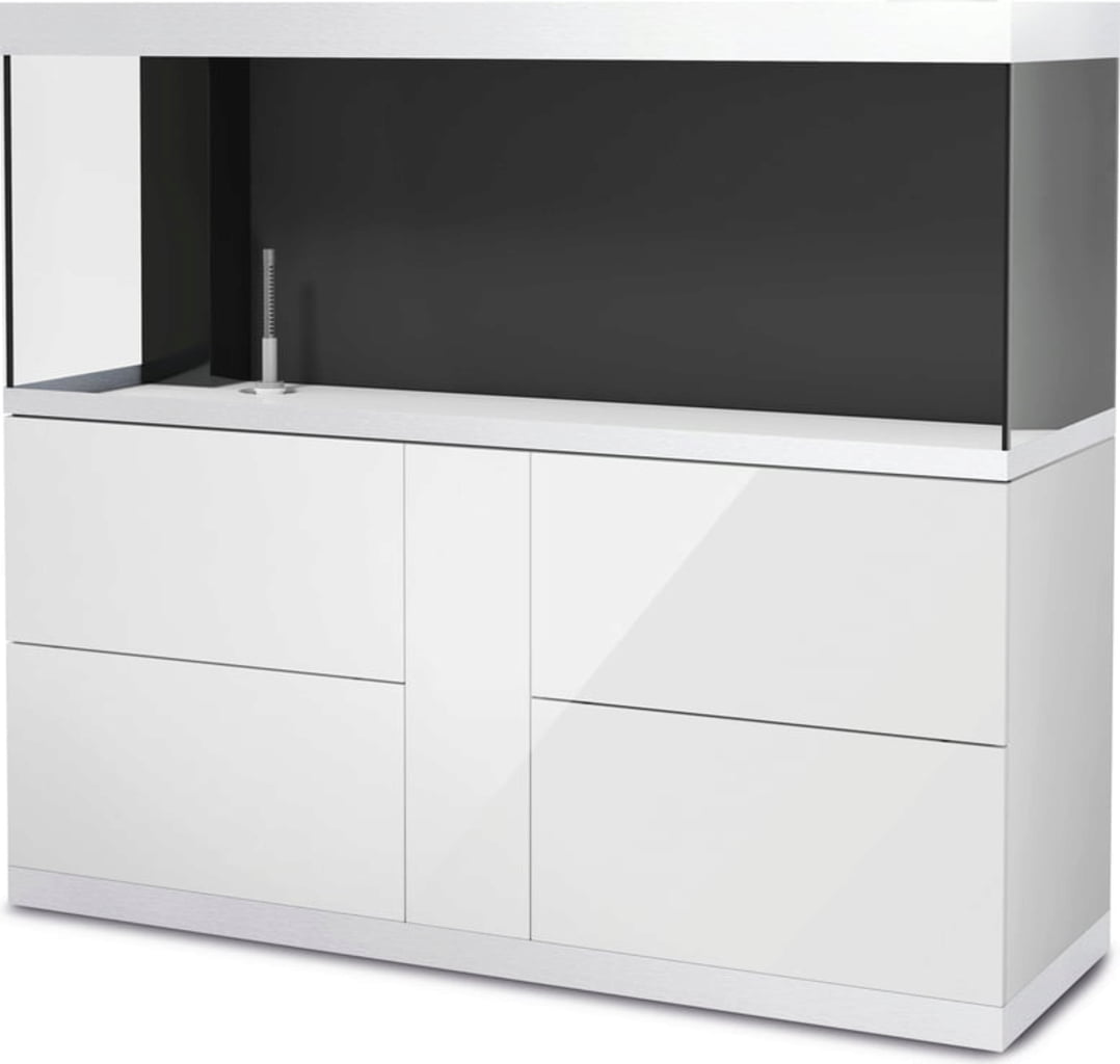 Las puertas del mueble sin tiradores con apertura por presión garantizan unas líneas limpias, y los embellecedores de aluminio del acuario ocultan además los bordes poco estéticos. Los muebles bajos HighLine para acuarios a partir de 200 litros pueden equiparse opcionalmente con hasta dos cajones en el mueble, proporcionando así más espacio de almacenamiento.