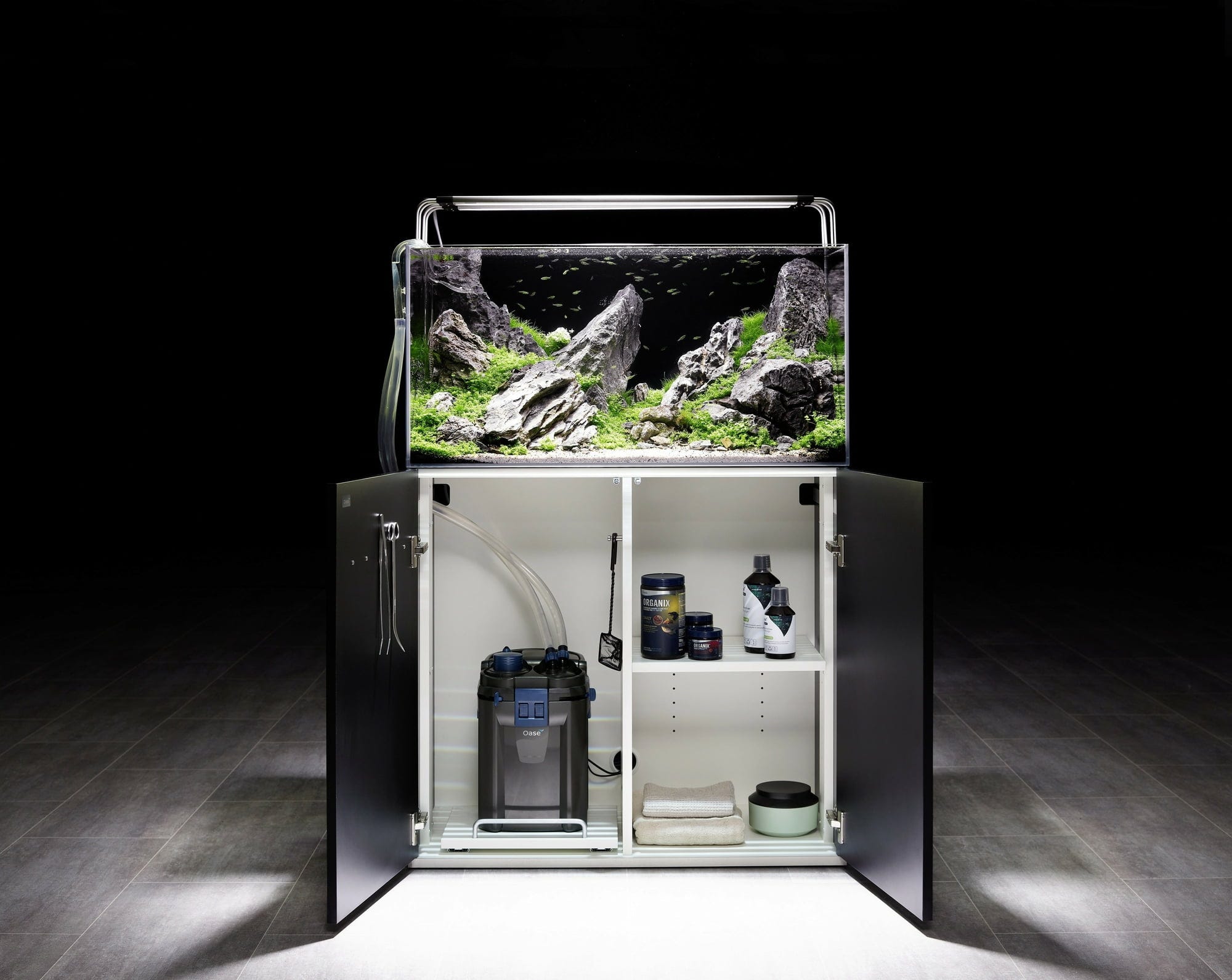 El set Oase ScaperLine 60 es adecuado para prácticamente cualquier entorno: tres tamaños y dos decoraciones de mueble en los colores negro y gris garantizan que su aquascape encaje en cualquier interior. Los aquascapers han diseñado esta combinación de acuario ScaperLine incorporando detalles prácticos sin igual.