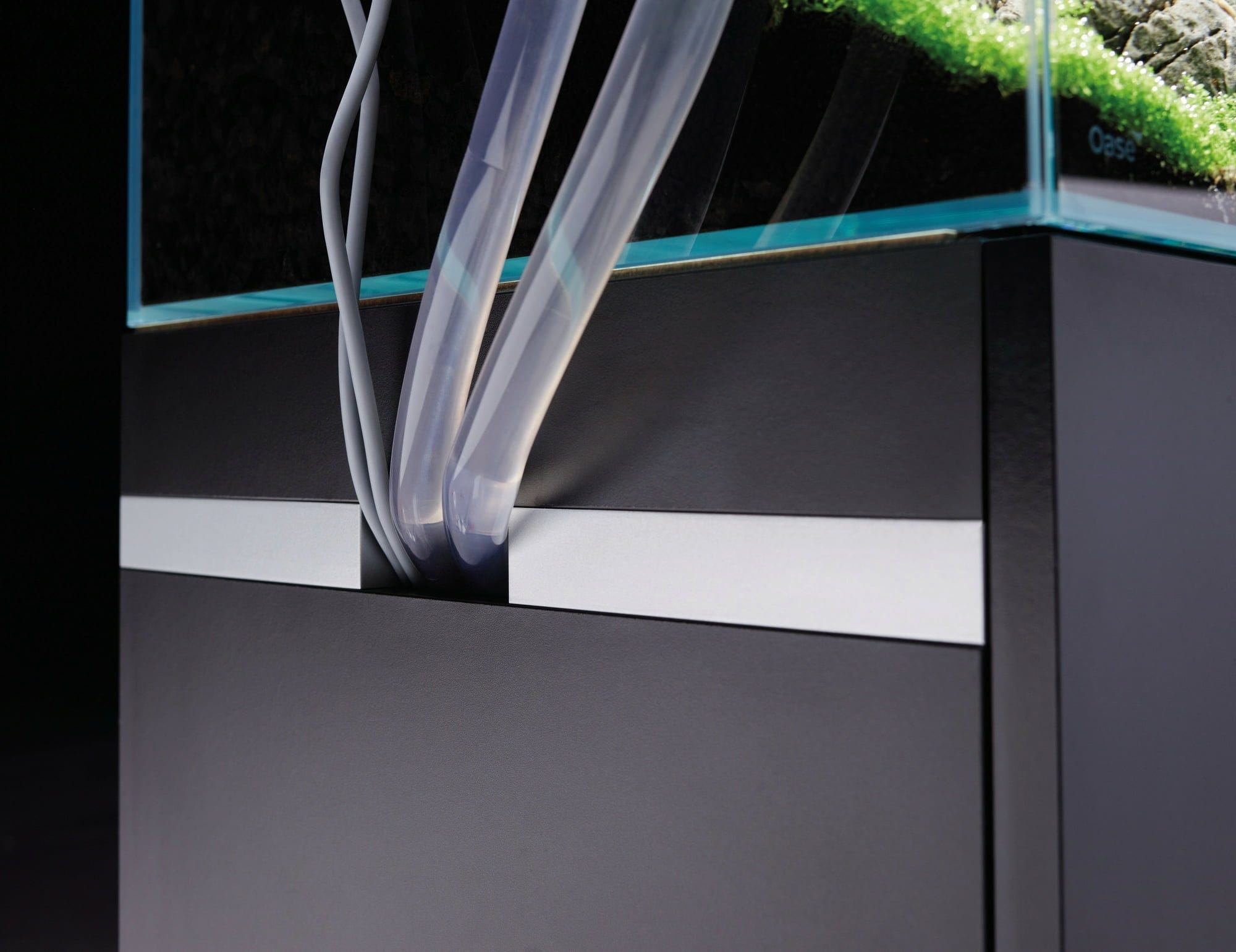 El pasacables del mueble y los bordes de cristal con un pulido especial garantizan líneas claras, proporcionando un marco estético a su obra de arte y asegurando un aspecto ordenado. Las dimensiones del acuario y del mueble encajan con precisión, de modo que el tanque queda perfectamente alineado con el mueble, sin bordes molestos.