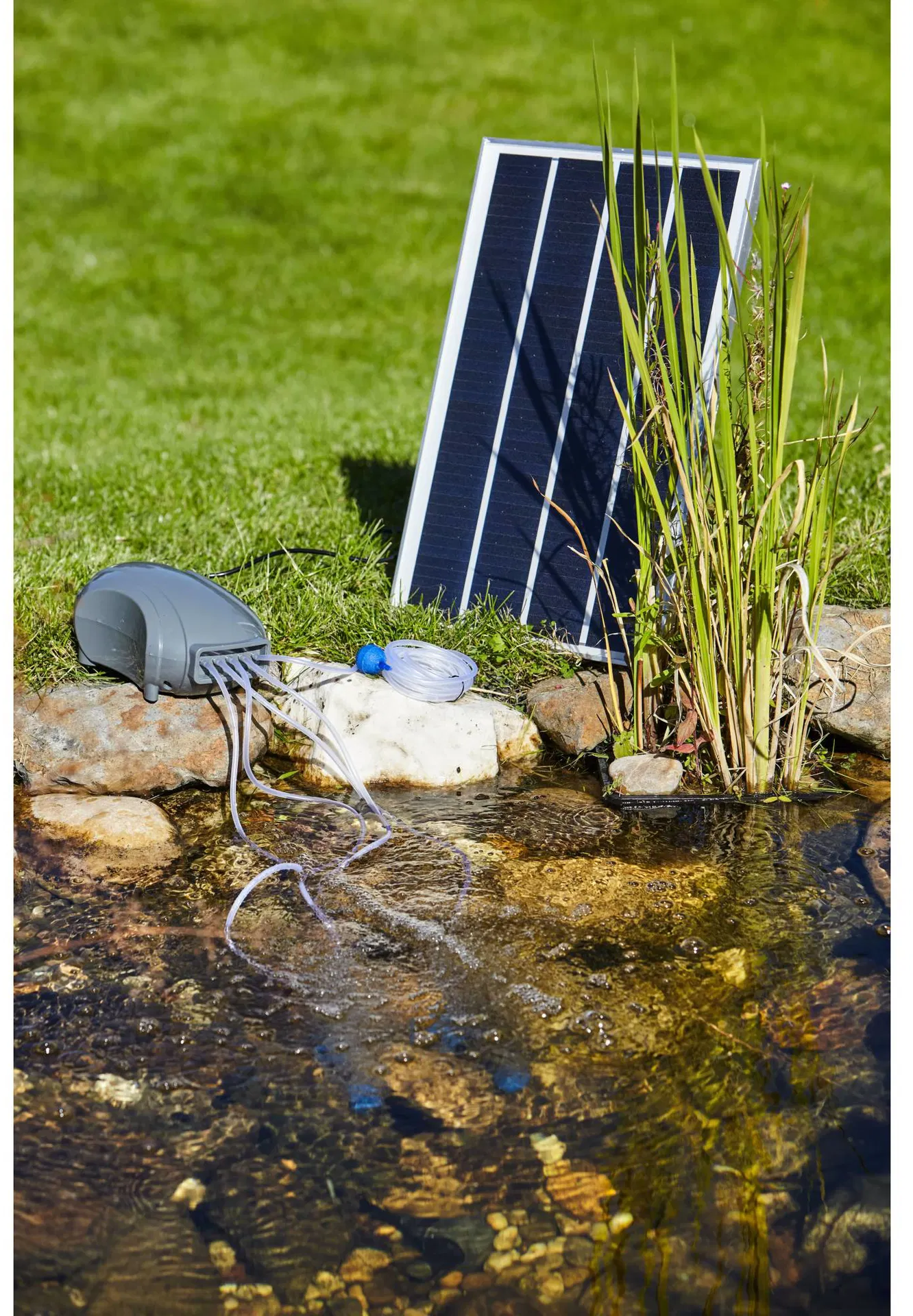 El aireador solar para estanques HEISSNER ofrece una solución ecológica e independiente de la red eléctrica para oxigenar estanques con una profundidad de agua de hasta 1,5 metros. El sistema utiliza un panel solar de alto rendimiento para alimentar directamente la bomba del aireador, ideal para instalaciones en lugares sin conexión eléctrica. Gracias al suministro selectivo de aire y a la circulación del agua resultante, se estabiliza el equilibrio biológico, se reduce el crecimiento de algas y se crea un entorno saludable para peces y plantas.