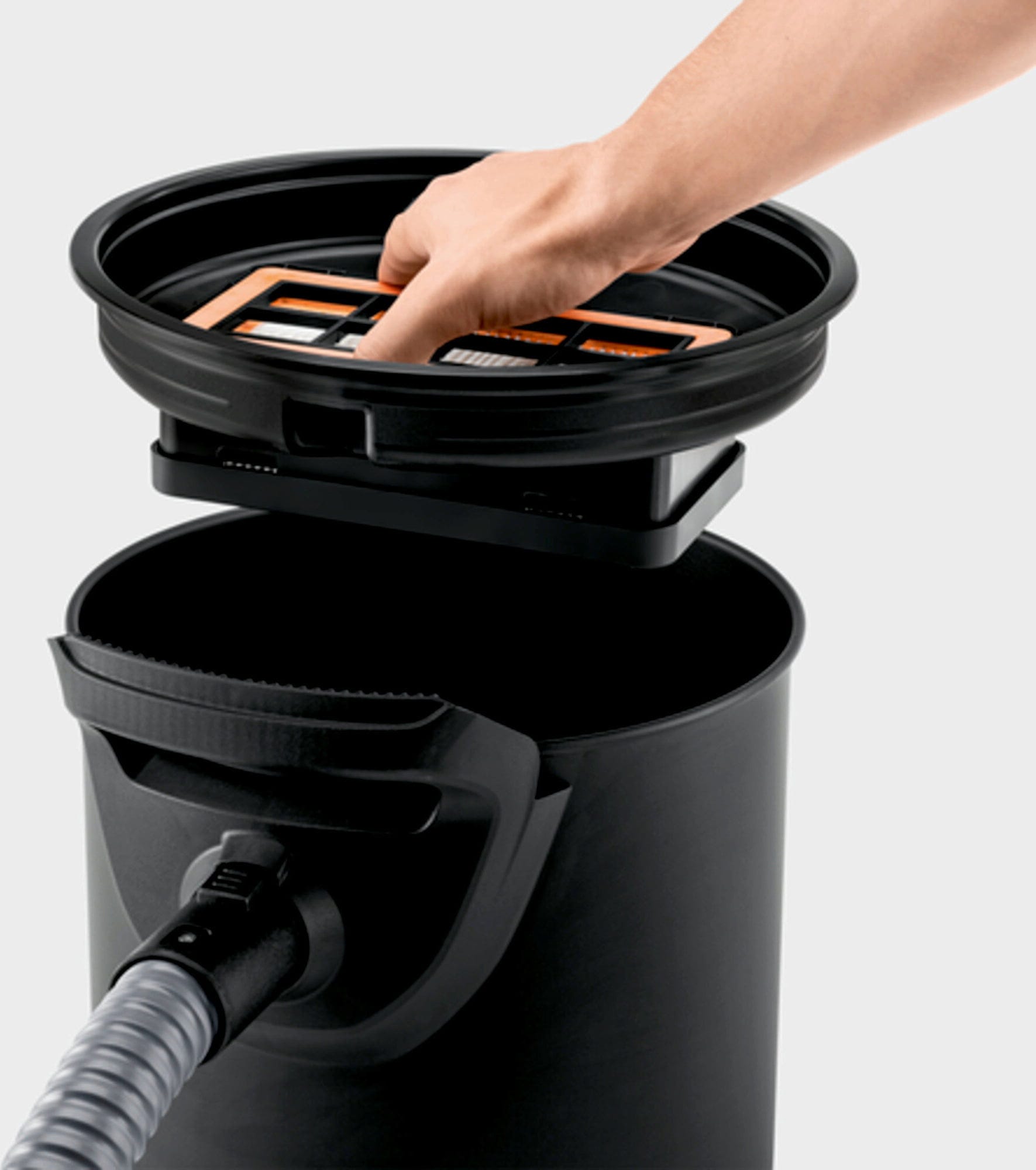 El sistema integrado de limpieza del filtro permite restaurar rápidamente la potencia de aspiración con solo pulsar un botón. El sistema filtrante, compuesto por filtro plisado y prefiltro metálico, garantiza una recogida segura incluso con partículas finas.