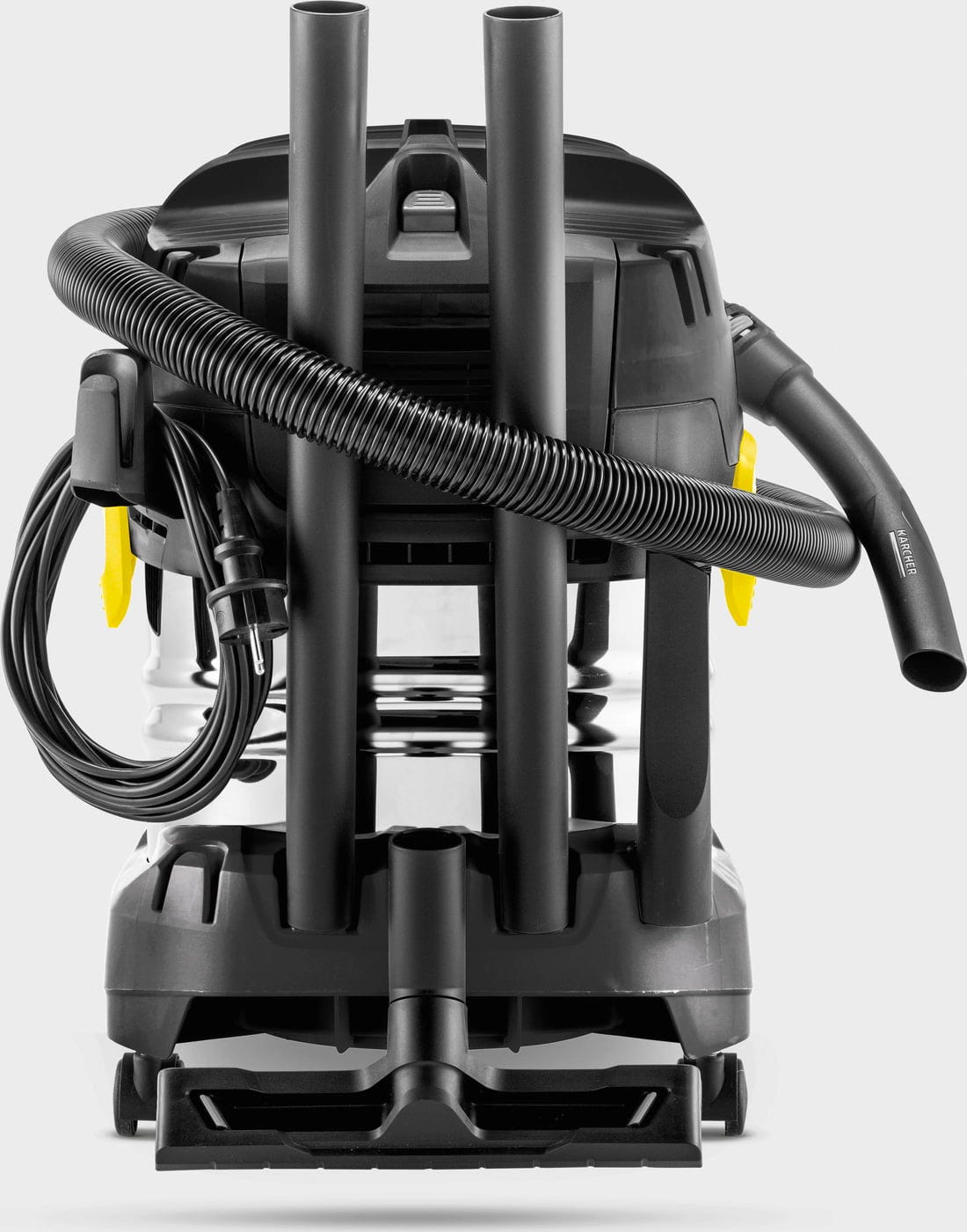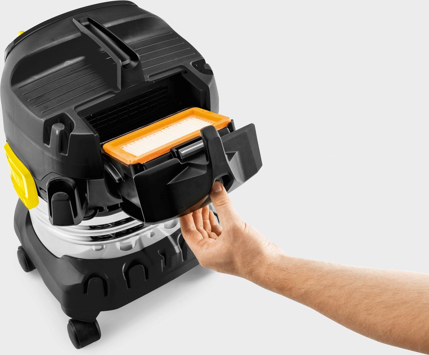 La WD 4 S Go!Further de Kärcher ha sido diseñada como una edición limitada en color negro y es adecuada para distintas tareas de limpieza en el taller, durante reformas y en el cuidado de vehículos. Con una potencia de aspiración de 240 W, el equipo trabaja de forma eficiente y elimina con fiabilidad suciedad seca y húmeda. El depósito de acero inoxidable de 20 l es robusto y está pensado para cantidades medias de suciedad, ideal para bricolaje, garaje o sótano.