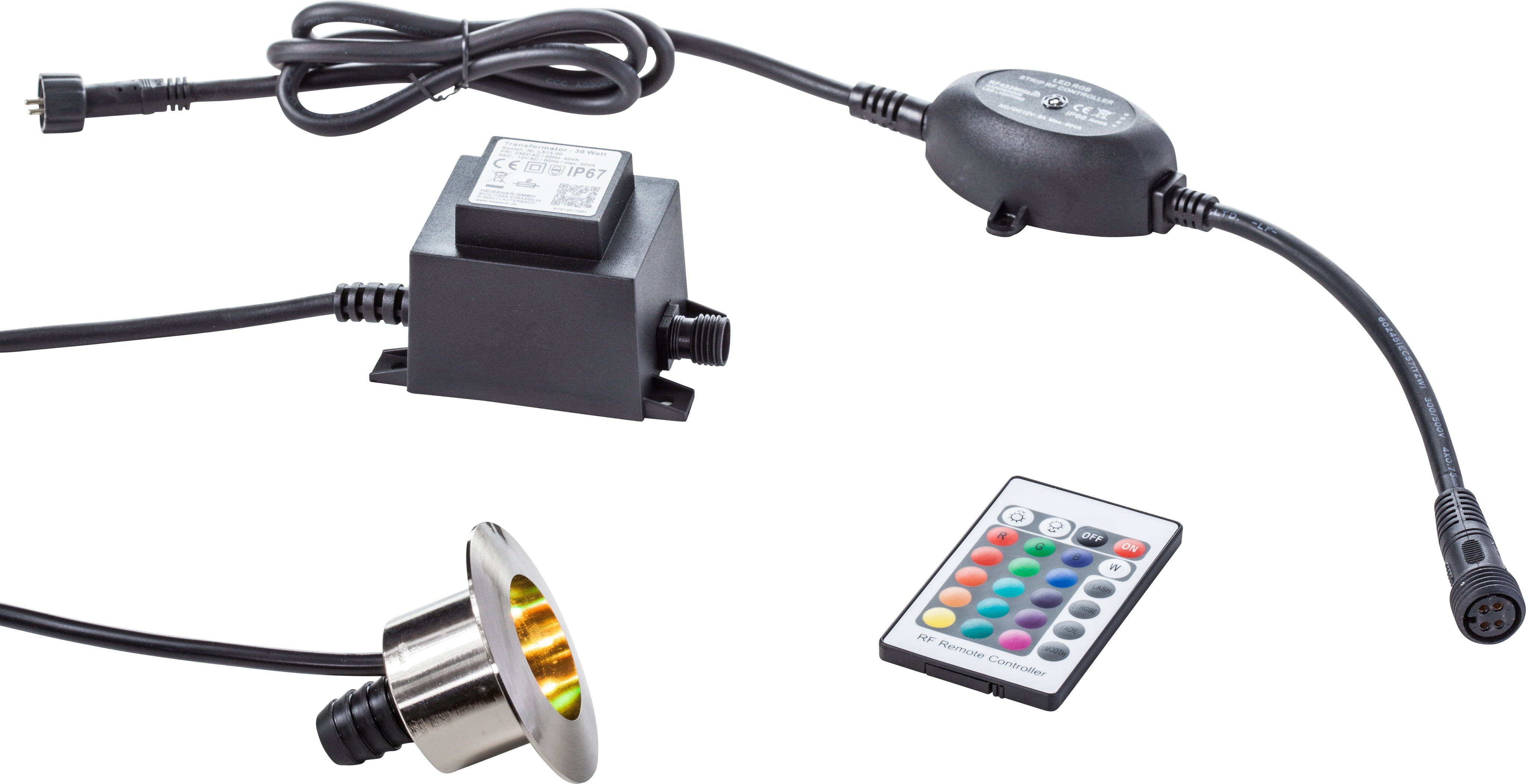 Este accesorio de tubo de luz inteligente RGB con transformador y controlador RGB de HEISSNER permite crear una eficaz iluminación de colores de piedras de manantial, fuentes de piedra y otros elementos acuáticos directamente en la salida del agua. A través del controlador RGB incluido en el set, se pueden gestionar numerosos programas de cambio de color y tonos personalizados. El sistema se puede integrar completamente en la serie HEISSNER Smart Light y se suministra con un transformador adecuado de 6 vatios y un cable de conexión de cinco metros de longitud para una instalación flexible.