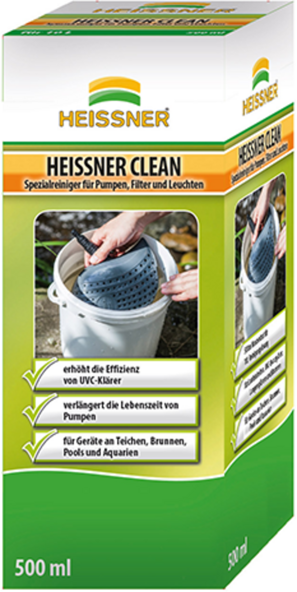 El limpiador especial HEISSNER de alta eficacia elimina en 24 horas la cal y otros depósitos minerales resistentes de las bombas, los componentes de los filtros y el cristal de cuarzo UVC. La limpieza a fondo de las piezas funcionales no sólo prolonga significativamente la vida útil de los dispositivos, sino que también restaura completamente la transmisión de luz y la eficiencia de los clarificadores UVC y las lámparas subacuáticas.