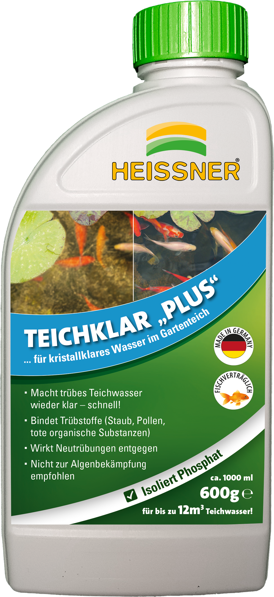 Teichklar Plus de HEISSNER es un concentrado líquido altamente eficaz que aclara el agua en pocas horas. El producto aglomera las partículas en suspensión más finas, como polvo, polen y partículas orgánicas, lo que permite eliminarlas fácilmente con una espumadera o un tamiz de malla fina. Otra ventaja es su capacidad para ligar los fosfatos, evitando así que el agua vuelva a enturbiarse.