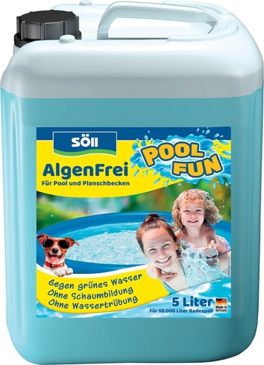 ¿Te has resbalado al entrar en la piscina o en la piscina infantil? Entonces es hora de restablecer los niveles de cloro AlgenFrei de Söll es un alguicida en forma líquida que contrarresta la formación de algas en piscinas pequeñas, spas y piscinas infantiles. Es muy fácil de usar y su efecto es duradero. El producto no enturbia el agua y también se puede utilizar en combinación con otros desinfectantes del agua como AquaDes de Söll.