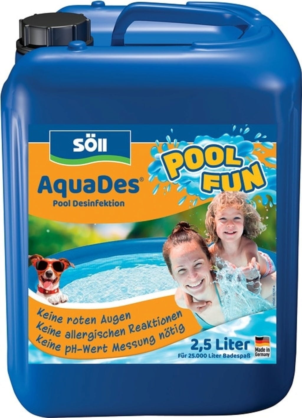AquaDes de Söll es el desinfectante del verano El producto puede utilizarse en piscinas pequeñas, piscinas infantiles y spas y es eficaz contra bacterias, hongos y esporas. AquaDes sólo contiene pequeñas cantidades de cloro, pero es esta cantidad la que tiene un efecto más duradero que el cloro concentrado. La consistencia líquida del producto hace que su uso sea un juego de niños, sin necesidad de medir previamente el valor de pH del agua.