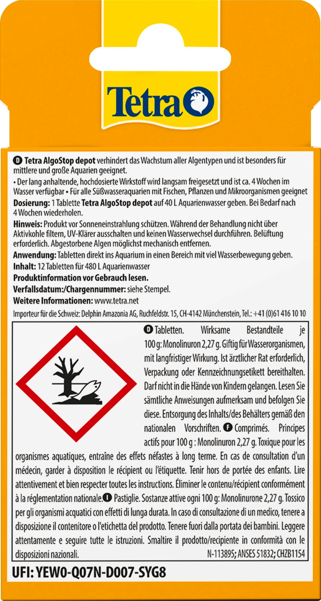 - Dosificación: Añadir 1 tableta de Tetra AlgoStop depot a 40 litros de agua del acuario.