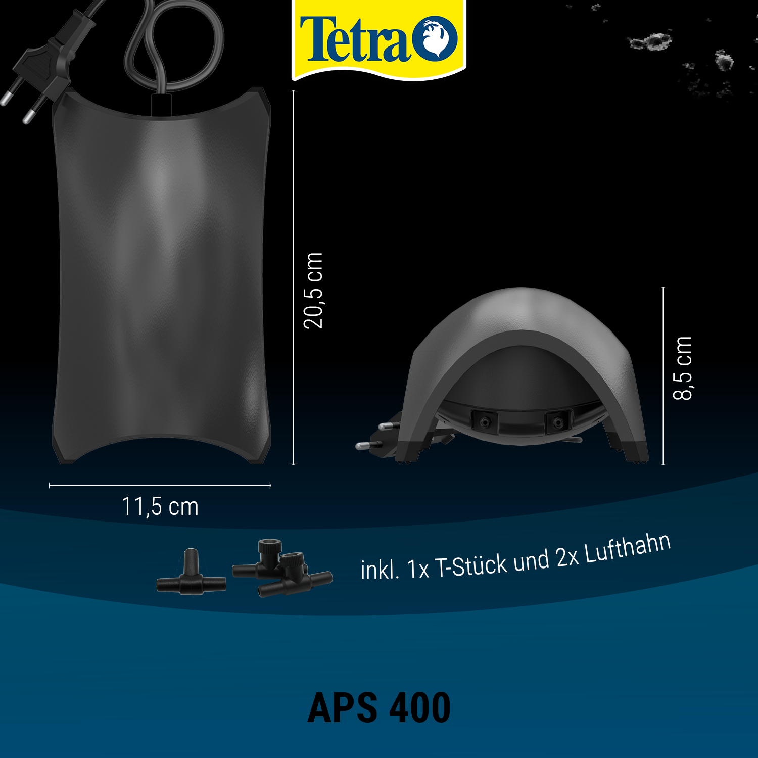 La bomba de aire para acuarios Tetra APS es una bomba de aire negra para acuarios y está diseñada para usarse con salidas de aire o filtros de elevación de aire en el acuario.