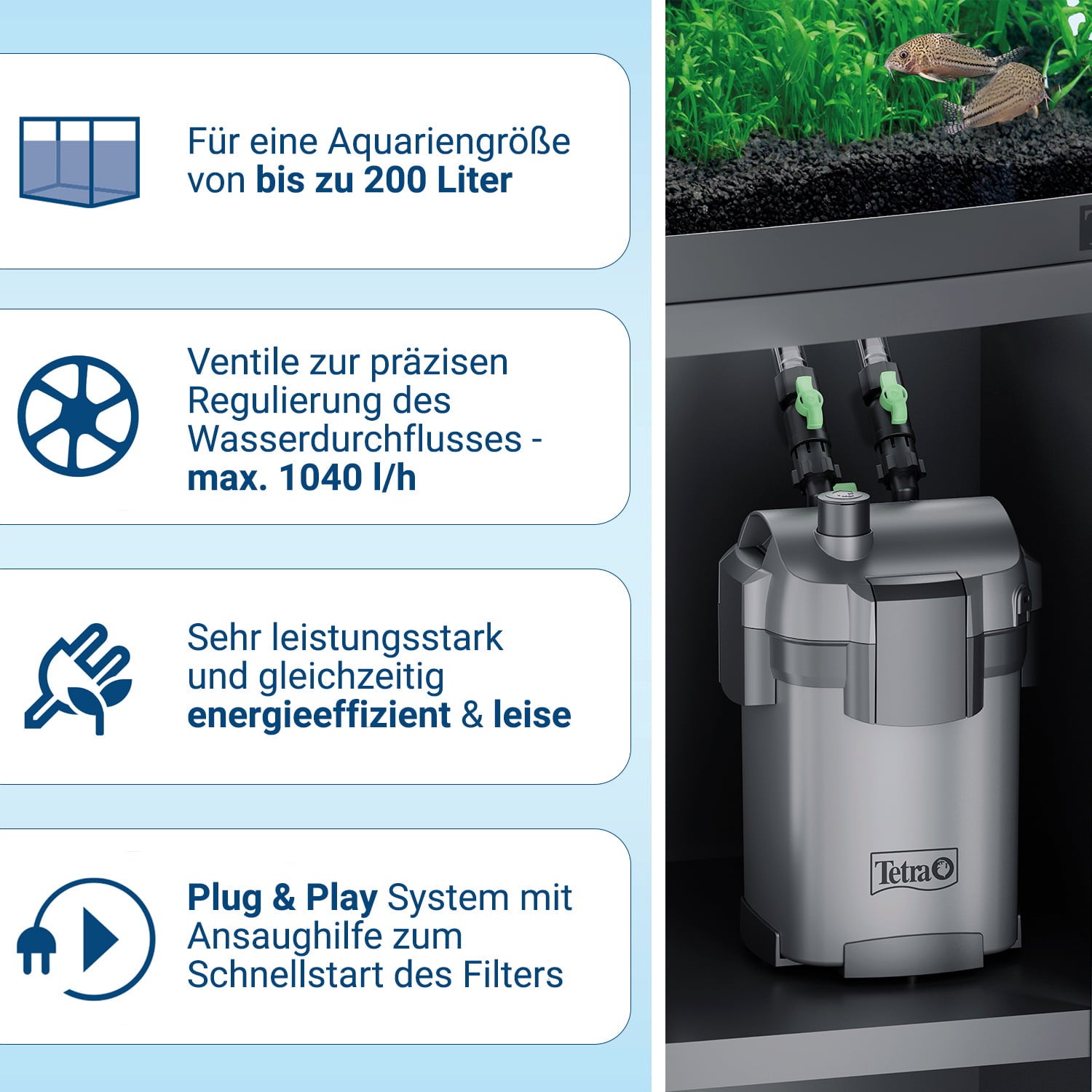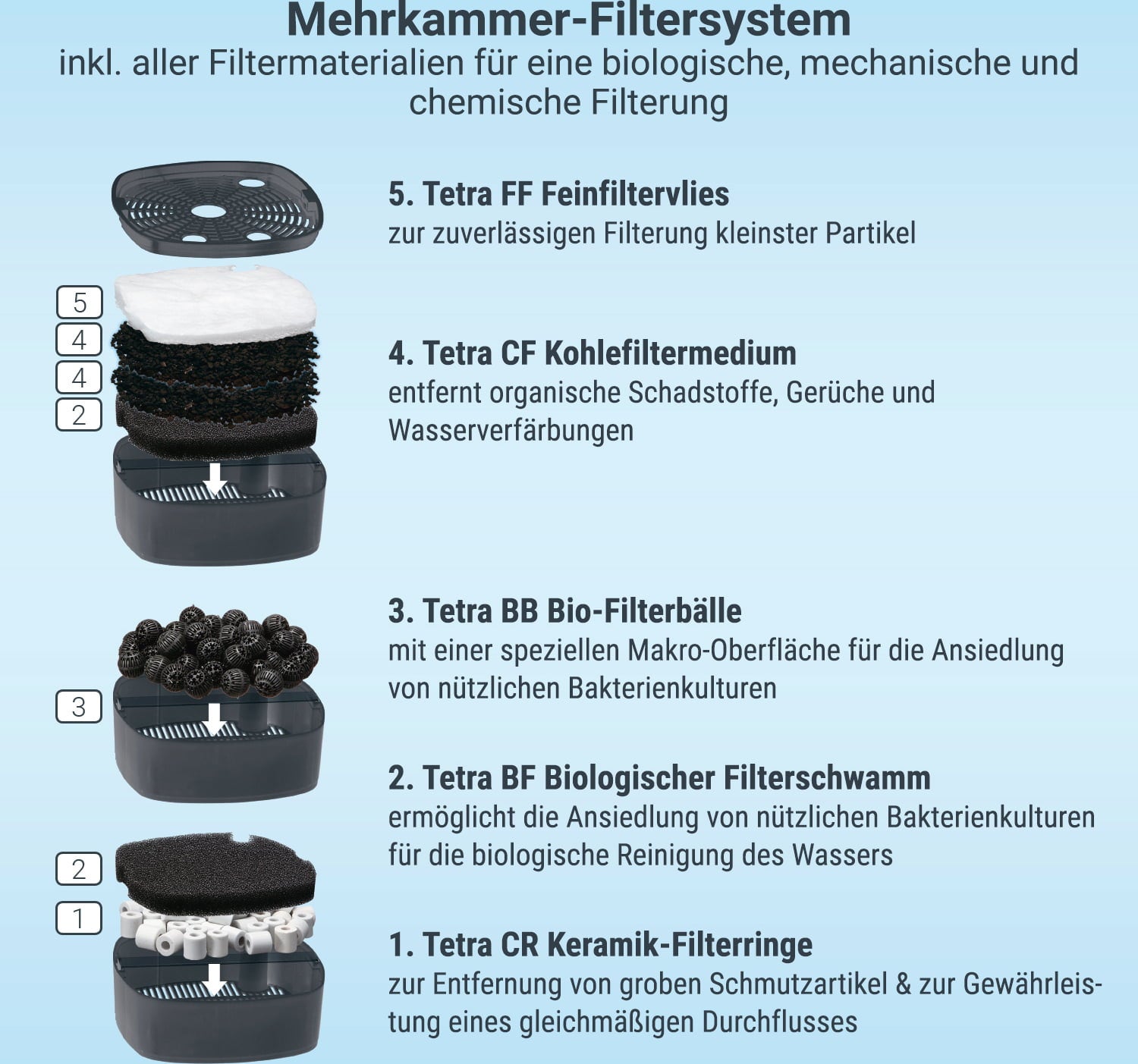 El sistema de filtrado especial de múltiples cámaras, que filtra el agua del acuario biológica, mecánica y químicamente hasta 5 veces, garantiza valores estables del agua. Tetra ofrece una variedad de medios filtrantes diferentes. Dependiendo de tus necesidades, puedes equipar el filtro con los siguientes medios: anillos filtrantes de cerámica, medios filtrantes de carbón, esponjas de filtro biológico, tela filtrante fina y bolas de filtro biológico especiales.