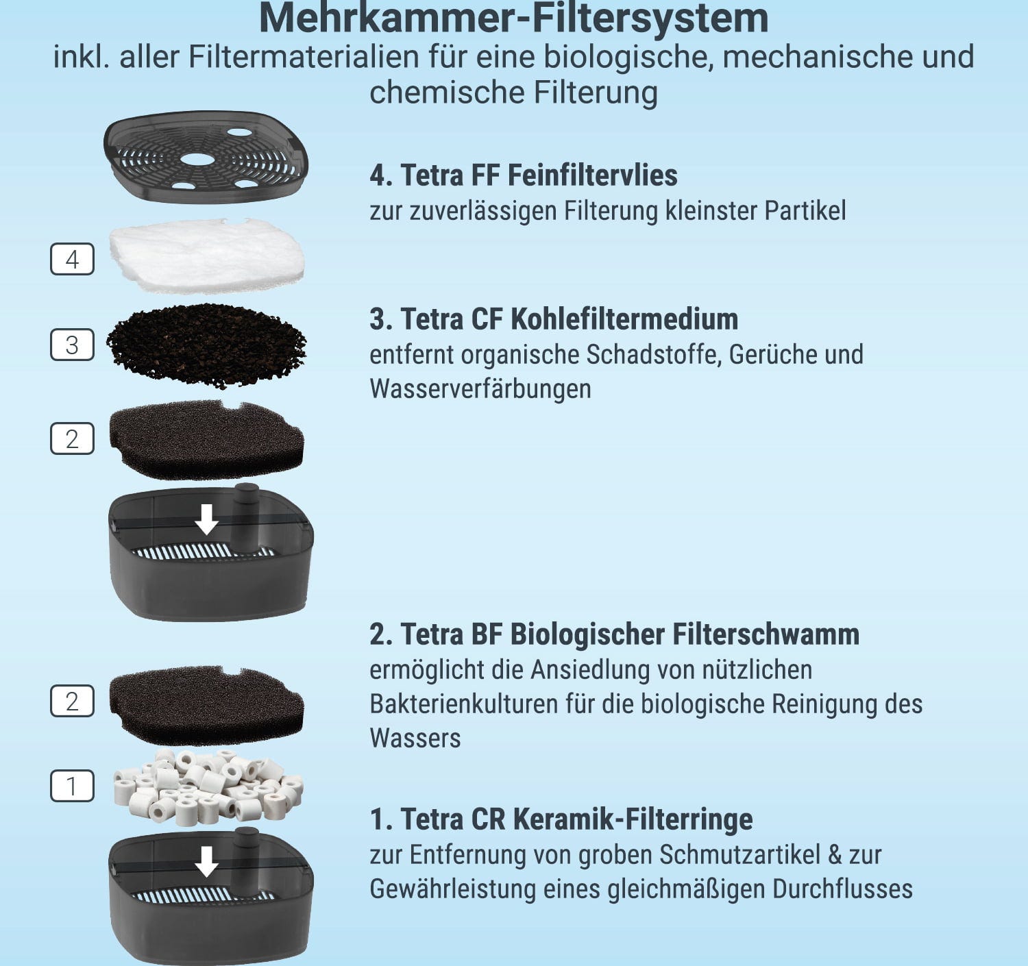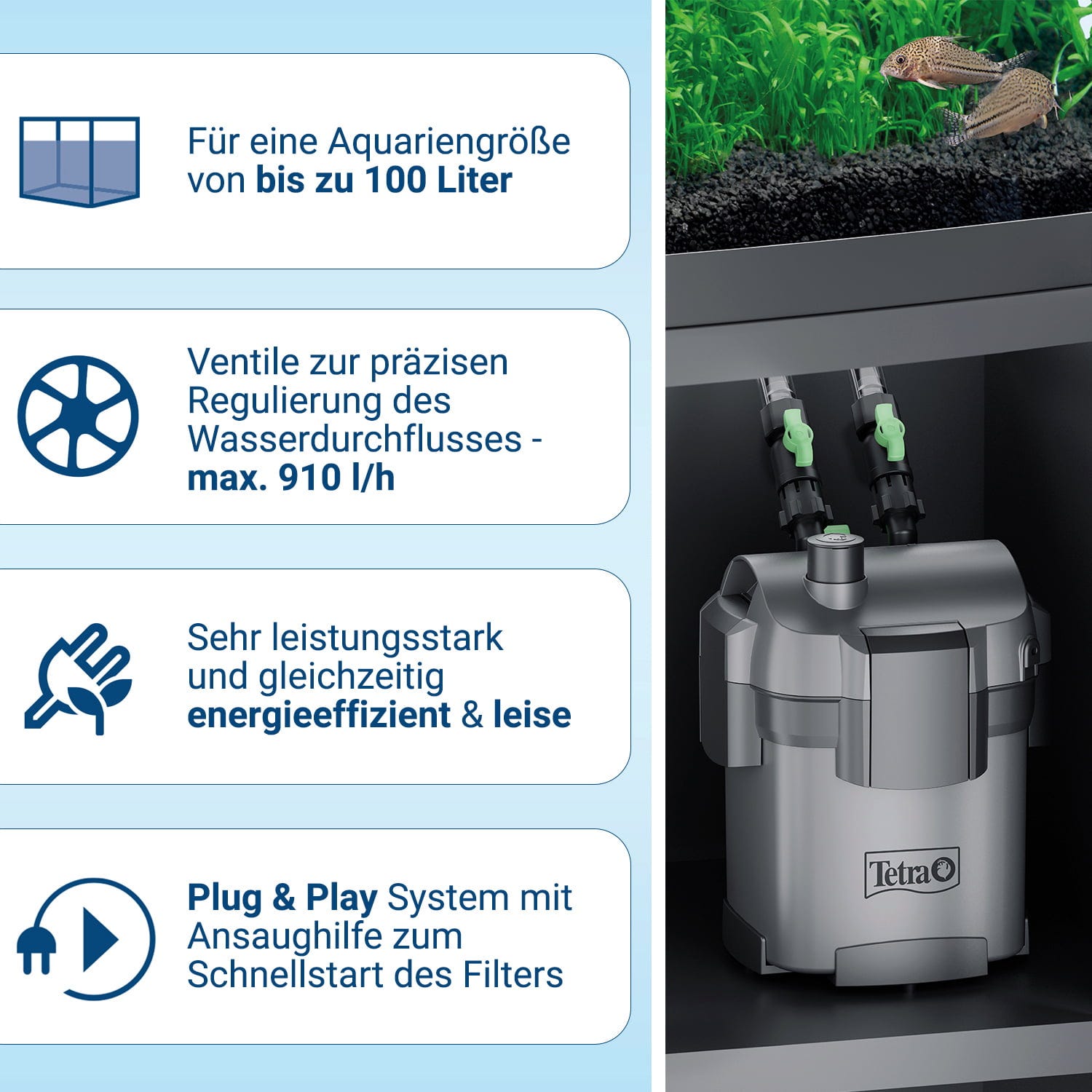 El sistema de filtrado especial de múltiples cámaras, que filtra el agua del acuario biológica, mecánica y químicamente hasta 5 veces, garantiza valores estables del agua. Tetra ofrece una variedad de medios filtrantes diferentes. Dependiendo de tus necesidades, puedes equipar el filtro con los siguientes medios: anillos filtrantes de cerámica, medios filtrantes de carbón, esponjas de filtro biológico, tela filtrante fina y bolas de filtro biológico especiales.