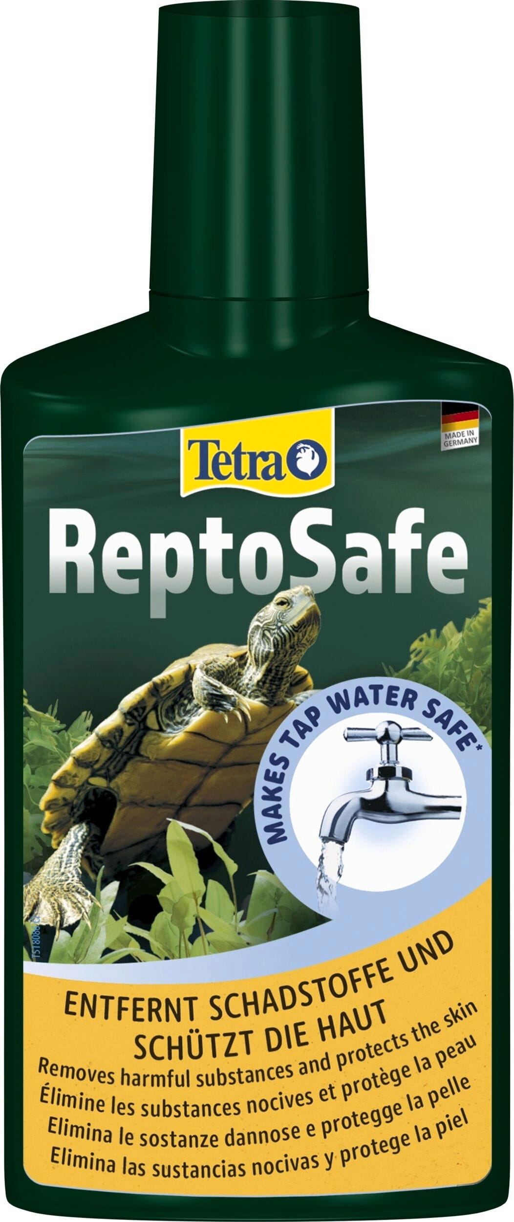 Tetra ReptoSafe trata de manera segura el agua del grifo y la convierte en agua natural apropiada para especies de reptiles acuáticos. Nneutraliza los contaminantes como el cloro, la cloramina y los metales pesados como el cobre o el zinc del agua del grifo. Las vitaminas y sustancias vitales que contiene favorecen la salud de los reptiles y también protegen las pieles sensibles.